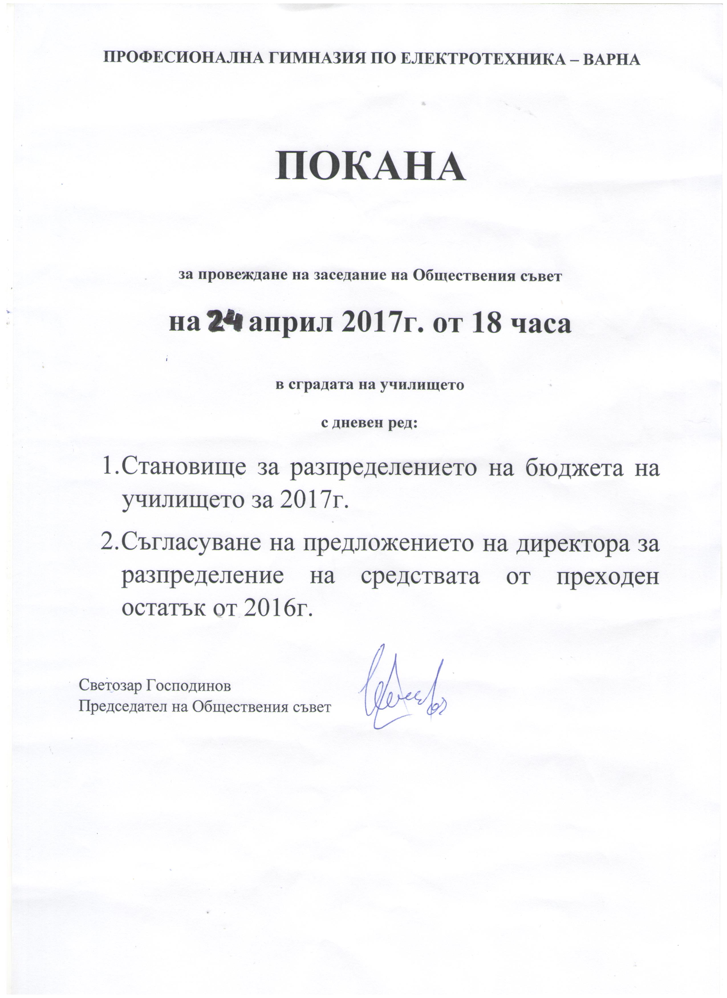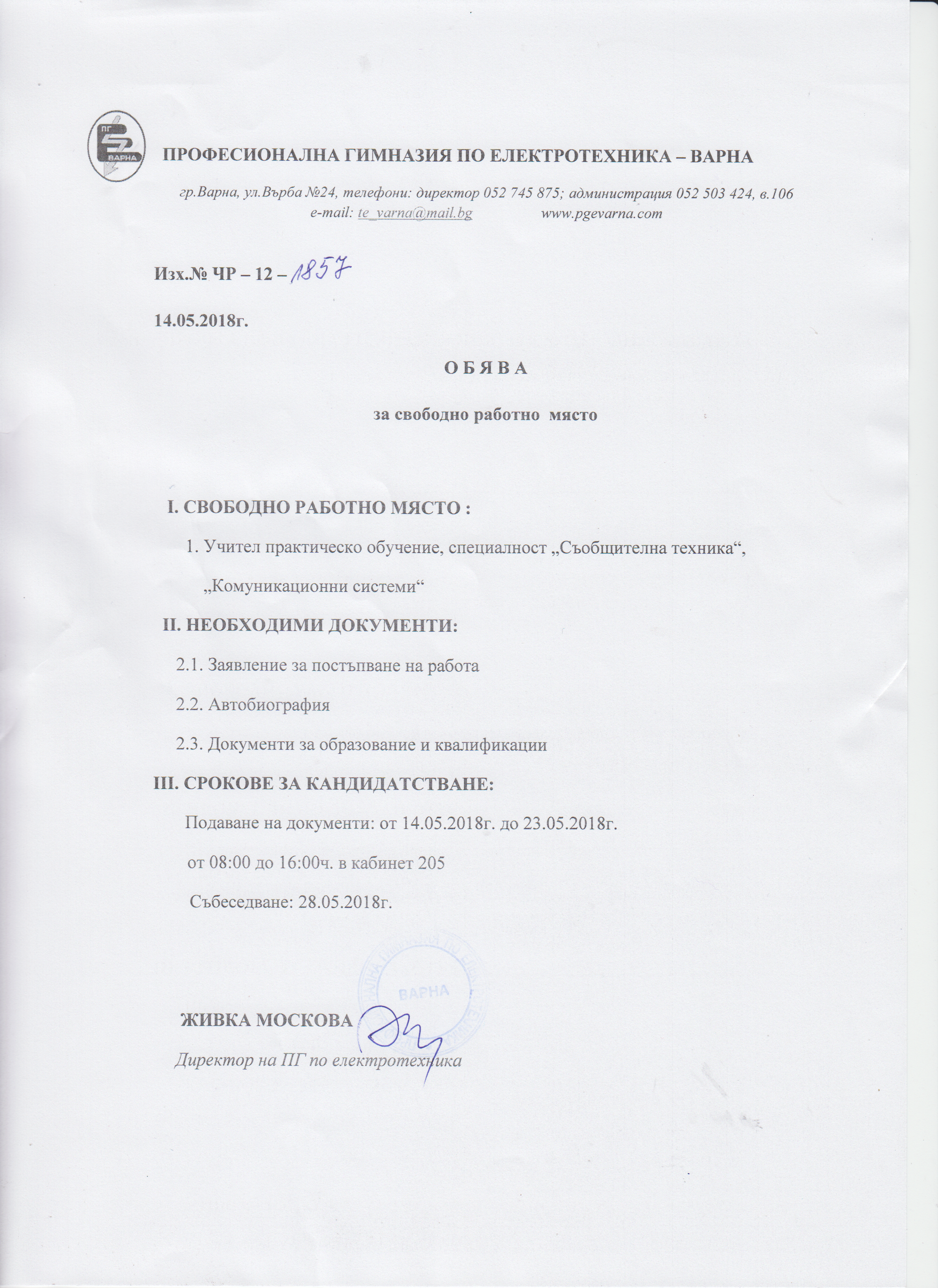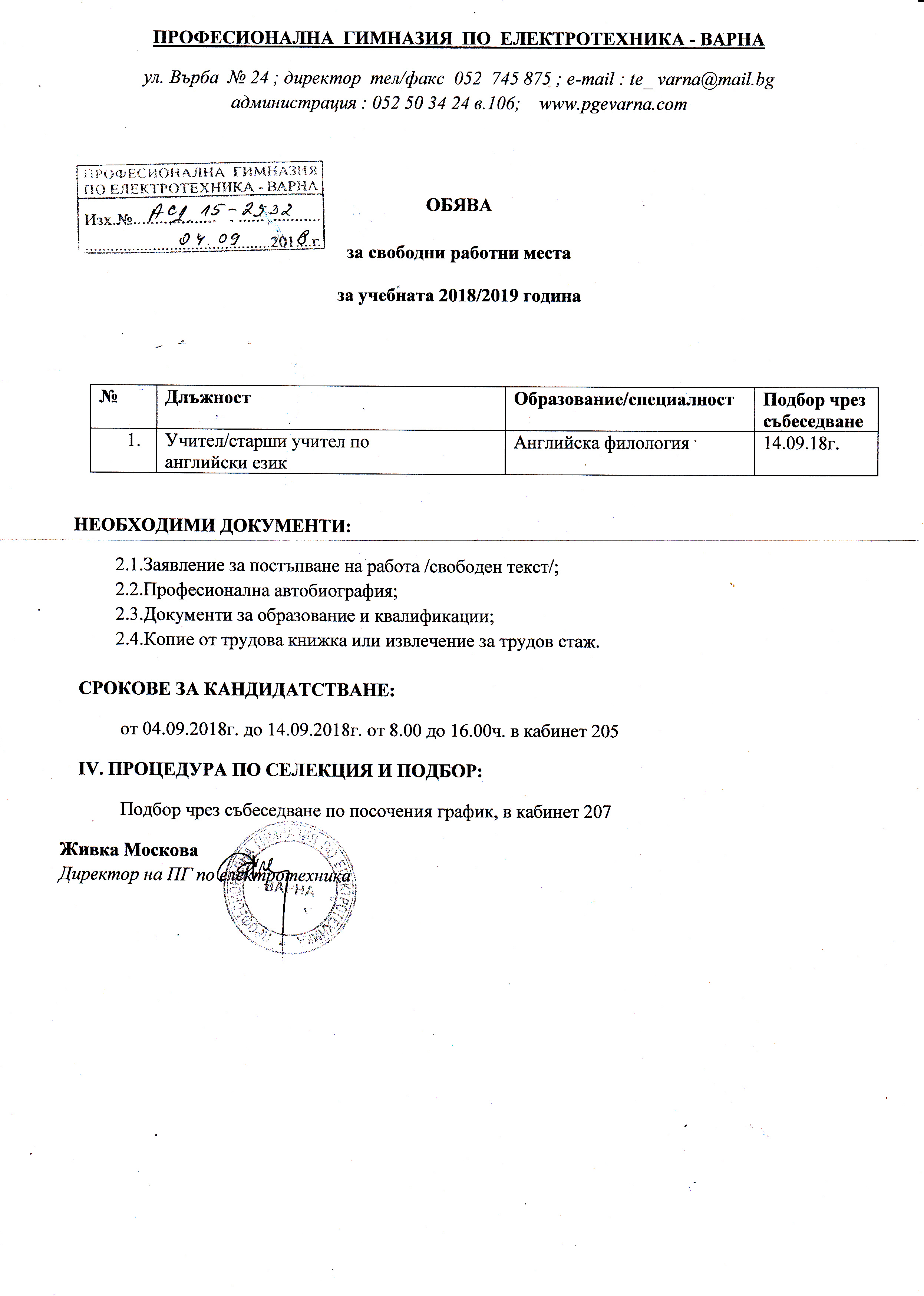 Със заповед на директора на ПГ по електротехника 11.01.2017г. е обявен за неучебен ден.